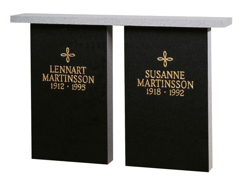 Textstenarnas framsidor polerade, överliggare och övriga ytor grovslipade. Dekor och text försänkt förgylld, stil 56.
